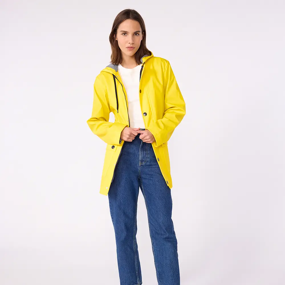 Le ciré pour femme Petit Bateau est l’une des pièces les plus iconiques des collections de la marque. Ayant traversé les générations, ce modèle inspiré de la tenue des pêcheurs bretons a tout pour plaire : doublure en coton milleraies douce et confortable, maille enduite déperlante idéale pour protéger de la pluie, coupe droite affinée mettant en valeur la silhouette… Mettez le ciré à l’honneur lors des jours pluvieux, dans un coloris classique ou saisonnier, pour un style punchy qui boostera votre tenue.